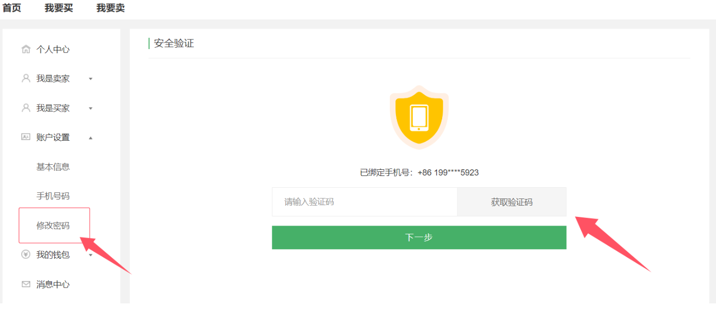 2、登陆成功后,点击左侧账号设置》》修改密码, 然后点击右侧获取验证码,点击下一步。